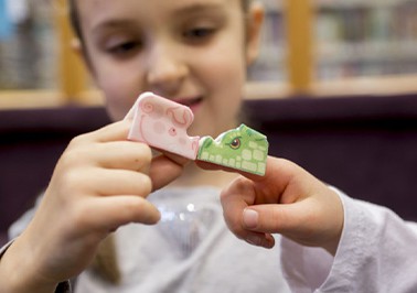 When Noggins are placed on scissors, they act as a visual cue, guiding the child to orient them correctly. They turn the scissors into a creature, with the bottom blade becoming the lower jaw. This enables the Noggin to “bite” and “chew” paper, showing the concept and technique of scissor use in a fun and playful way.