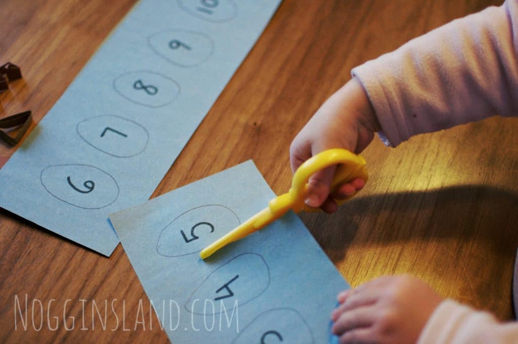 If your preschooler has been working on using scissors for awhile, let them cut out the eggs. Always supervise your preschooler when using scissors and consider using safety scissors while they are first learning. If you have a 3 year old that isn’t as skilled with using scissors yet, you may want to cut the eggs out yourself.