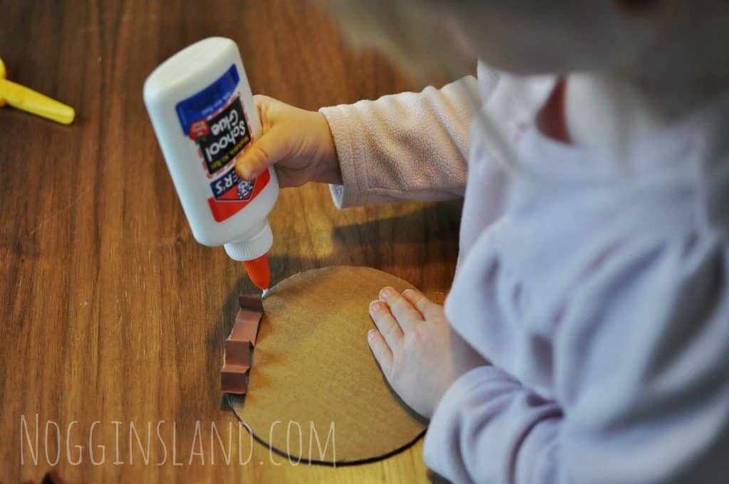 If you want your child to strengthen their fine motor skills, it’s important to step back here and let them do what they can on their own. As they squeeze the glue bottle and pick up and paste down each item, they’ll be strengthening their pincer grasp. When they’re done, set the nest aside to dry.