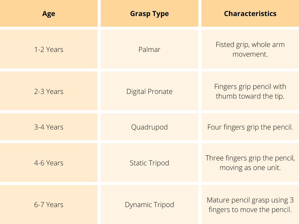 The following pencil grasp development chart can help you know what to expect as your child grows. But please keep in mind that every child is different.