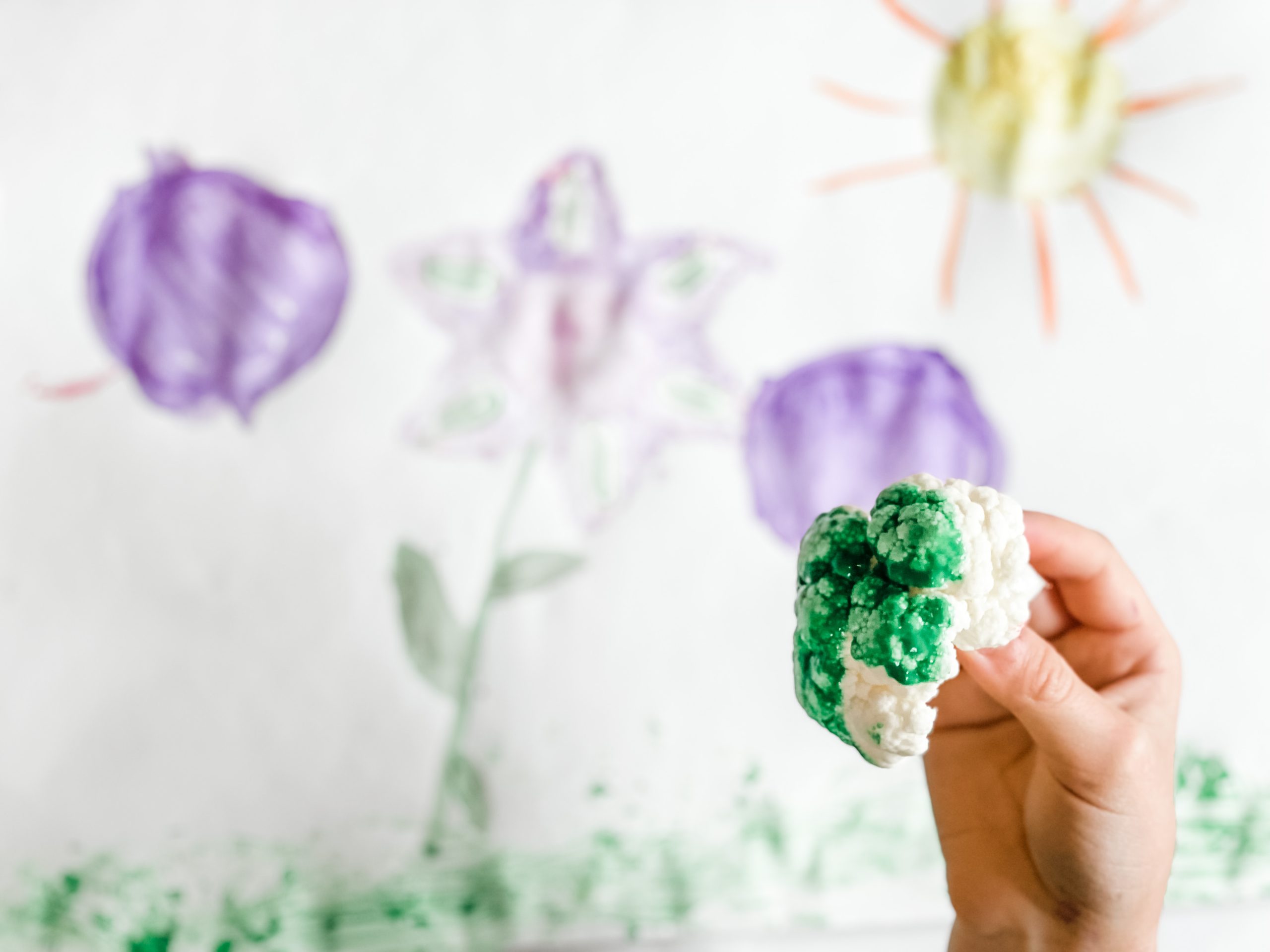 + CREATIVITY. Painting with vegetables and fruit is fun for kids! A blank canvas or sheet of paper, and a plate full of solid colors to imagine, explore, and